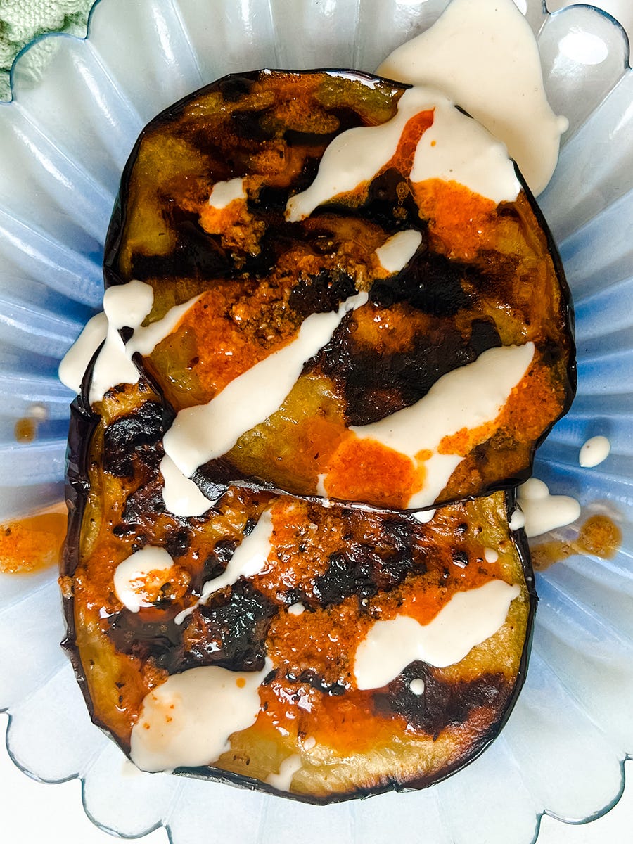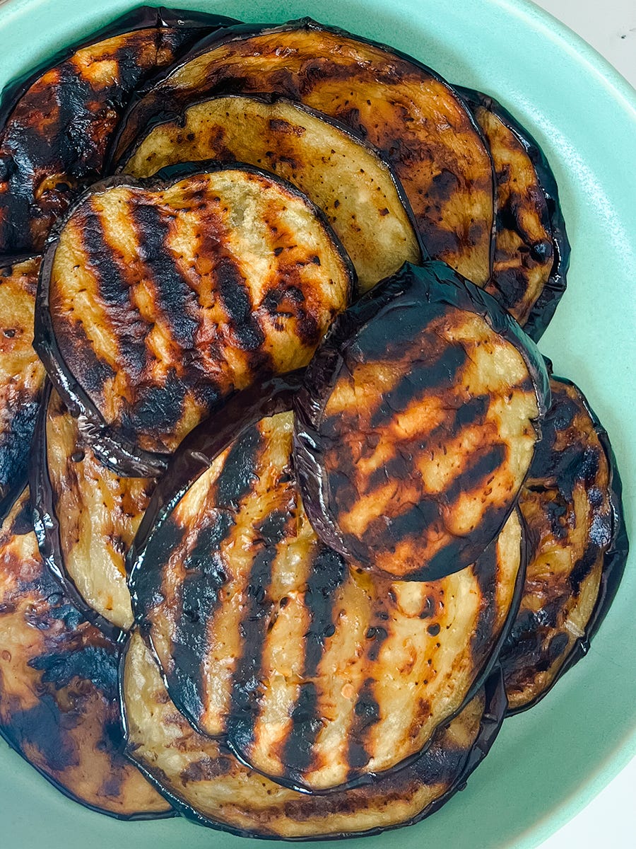 If you want to grill or fry an eggplant, slice it into ¼” pieces, then salt both sides and rest on tea towels to get the excess liquid out. After a few minutes, pat them dry and brush both sides with oil. Cook on high heat until they’re slightly darker than you think they should be.