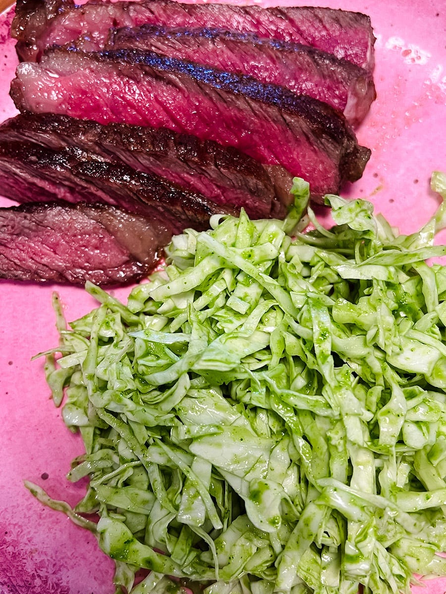 We make steak for dinner at least once a week, usually paired with a salad. When the farmer’s market is open, we love stocking up on ribeyes from Cotton Cattle and freezing them for later. Steak may sound daunting, but it doesn’t take a lot of effort to make a perfectly cooked, flavorful steak. While it cooks, mix up the salad and you’re ready to eat. (You can also wrap it up in a tortilla if you feel like it.)