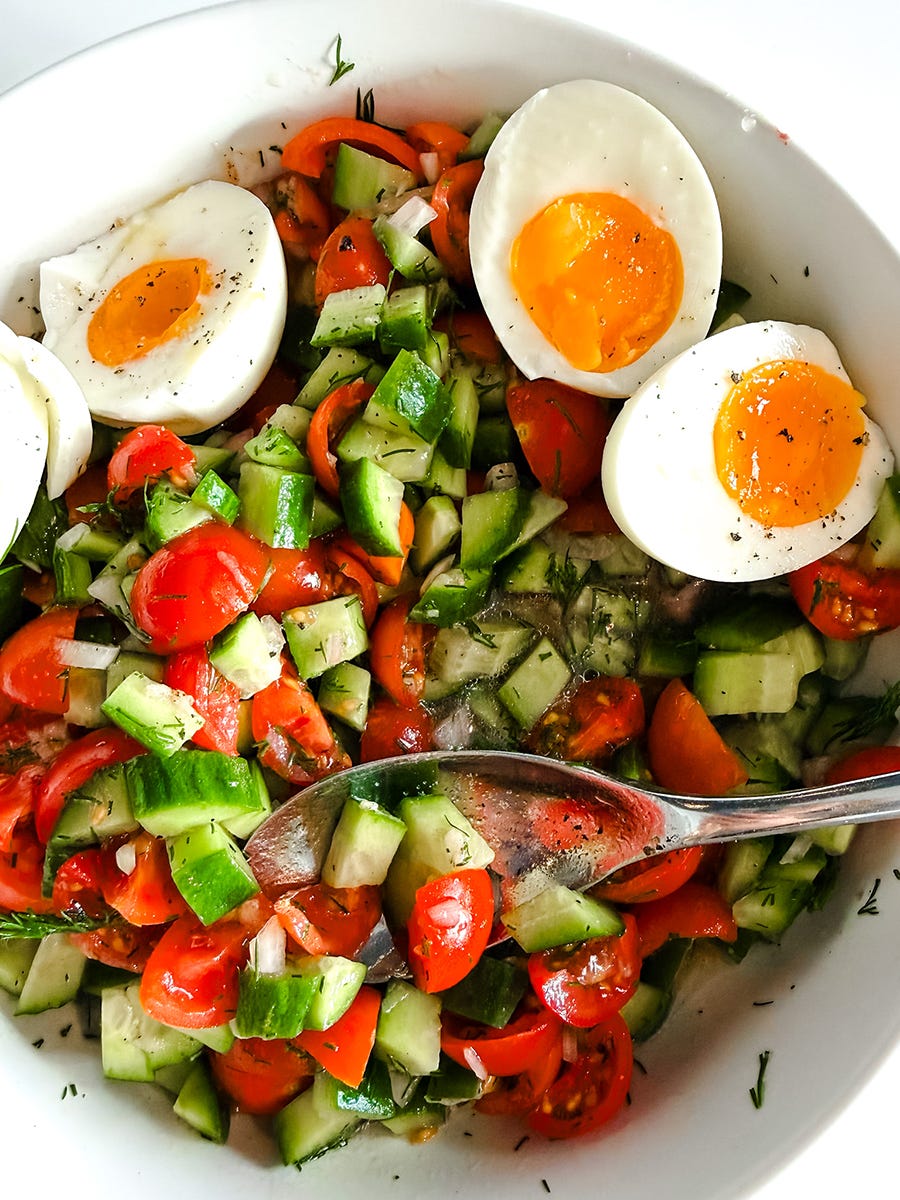 Veggies: Leftover salad (this one specifically), jammy eggs, Castelvetrano olives, roasted beets, sliced carrots…really anything in my fridge!