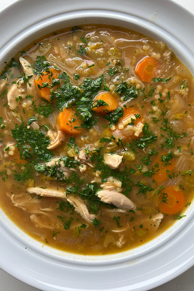 A soup becomes a meal when it includes a green, a grain, and protein. Here are a few tips for making a heartier soup: