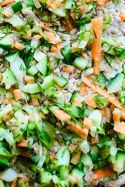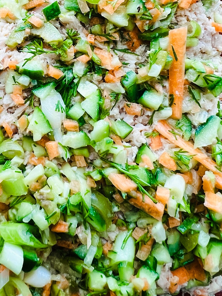 Tuna salad is one of my go-to meals whenever I feel like we have nothing to eat. I always have a can of tuna in the pantry. It’s also the easiest meal to change up based on what you have—for crunch, add cukes, carrot, pickles, or celery (or a mix!); for flavor, add herbs and scallions; and to make it creamy, use mayo, mustard, lemon juice, pickle juice, avocado, or even tahini. There are so many opportunities. Stuff it in a pita with a few cucumbers for a delicious lunch or dinner.
