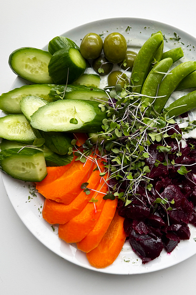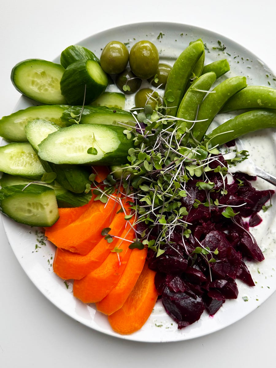 This could easily be a grazing board as you get dinner ready, but I’ve been eating it at lunch when I work from home. I don’t like yogurt and find that making it savory makes it 100x better. It’s basically a dip with as many veggies as you want to add on top of it. Adding pita is also a great idea. (I had roasted beets leftover in the fridge, but since we’re not turning on ovens, look for ready-to-eat roasted beets at the store.)