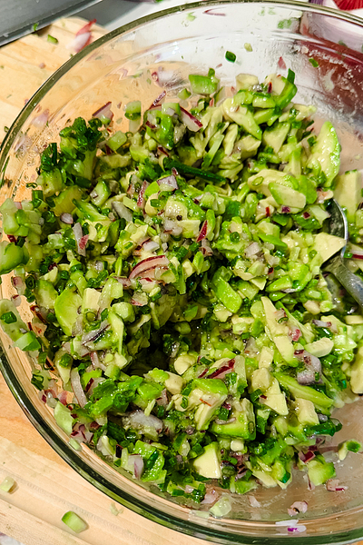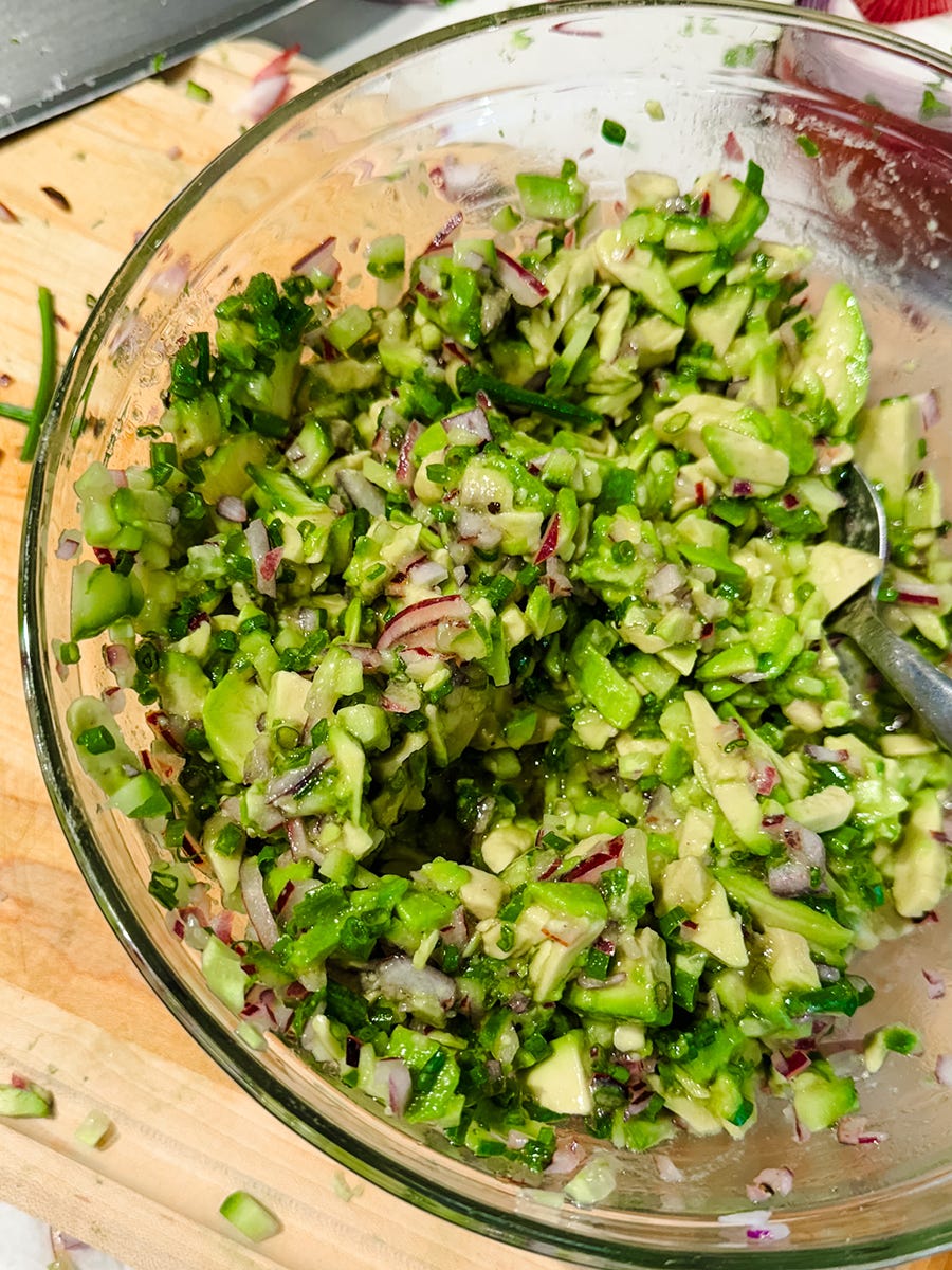 If you decide not to make the avocado salad, use a shallot for this recipe instead of a red onion so you don’t end up with a rogue onion half. If you prefer a more subdued onion taste, soak the onion/shallot in cold water for 5 minutes before adding to the salad.