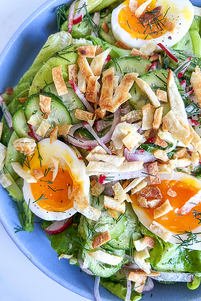 To serve, plate the salad and top with jammy eggs and the crunchy tortilla strips.