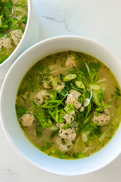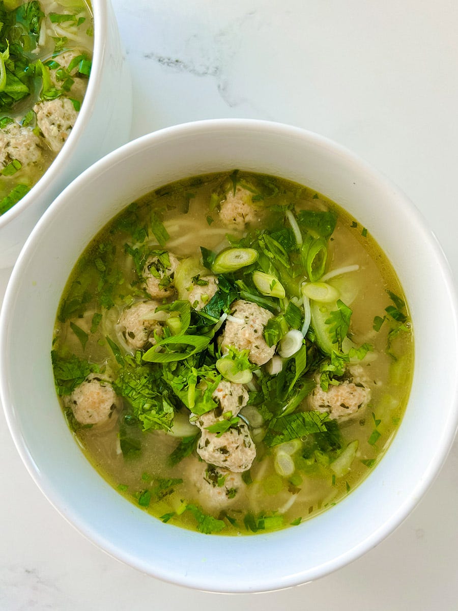 Not to be confused with green soup, this brothy soup has rice noodles and the most flavorful chicken meatballs that cook right in the broth. The longest part is rolling the balls—once that’s done, it’s ready to go.