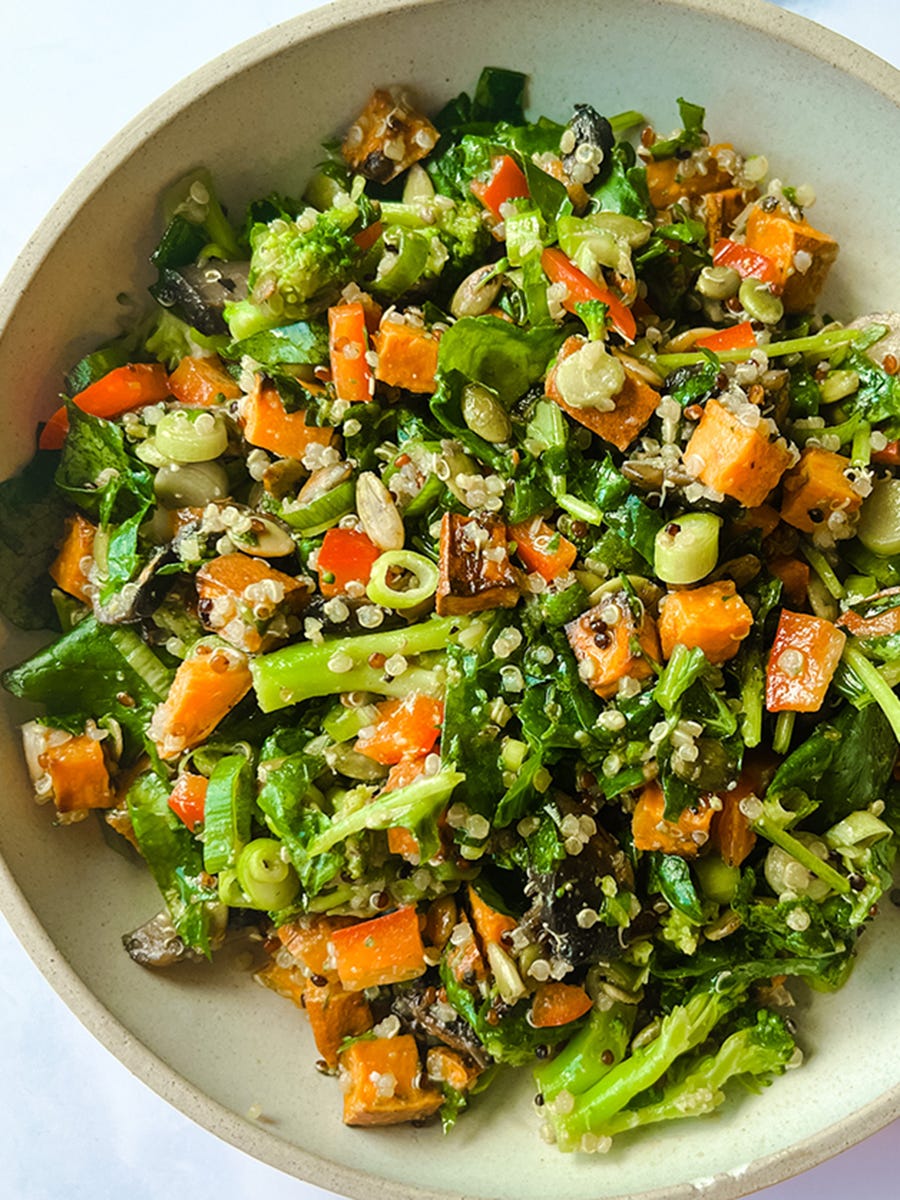 This salad would be the perfect way to repurpose last night’s dinner for this morning’s breakfast. Roast up some sweet potatoes and broccoli the night before to serve with quinoa, then toss it all together into another delicious meal. It’s even better with an egg on top, but you already have protein from the quinoa!