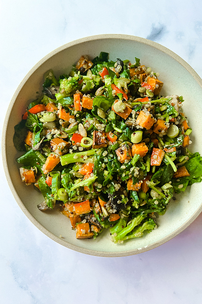 Dressing: Cook’s choice! Really, I’ll use whatever I have in my fridge, which is often Miso Vinaigrette or Green Goddess.