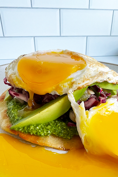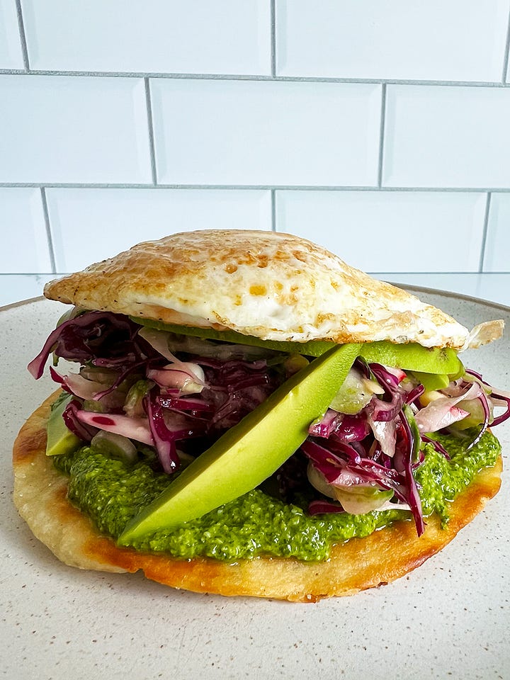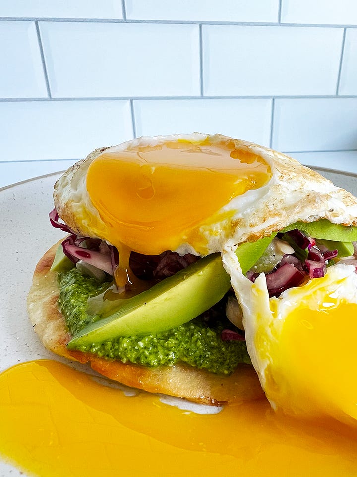 Of course, I’m going to give you the exact recipe for this incredible version, but the options are endless. You can use any spread (kale pesto, Green Goddess, cottage cheese, etc, etc) and any salad you have, top it with sliced avocado and a fried egg, then serve. With so many flavors and textures, it’s a super-satisfying meal and a great way to eat leftovers.