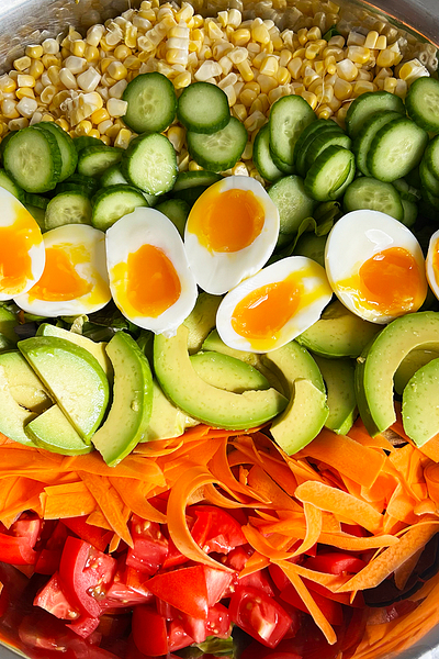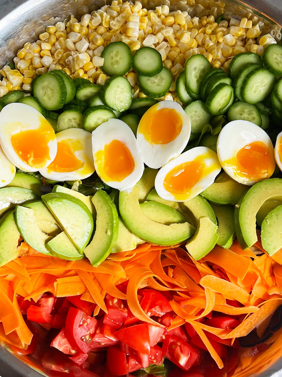 Cobb salad is one of my go-to orders when we go out to eat (hold the bleu cheese). This version is my favorite to make with fresh summer produce—fresh corn (cut off the cob), juicy tomatoes, and sliced cucumbers make it light and bright. I used 6-minute eggs for this, but here’s a handy pic for your reference when boiling eggs to your liking. 7-8 minutes will give you a perfectly jammy center. (Of course, the eggs serve well as protein on their own, but if you want more add the grilled chicken. It’s one of my other go-to recipes.)