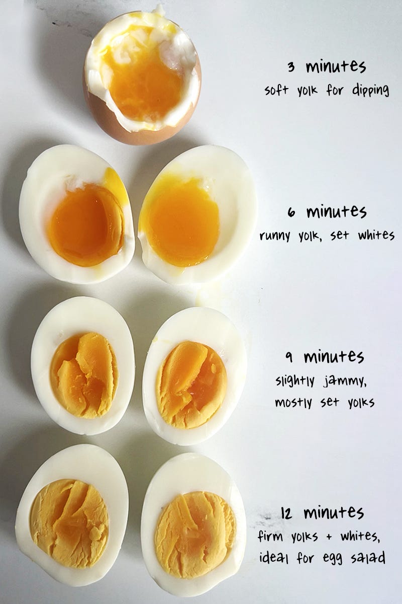 Bring a large pot of water to a boil, add the eggs (carefully, I like to use a spider), and set the timer. Once time is up, transfer to an ice bath to stop the cooking.