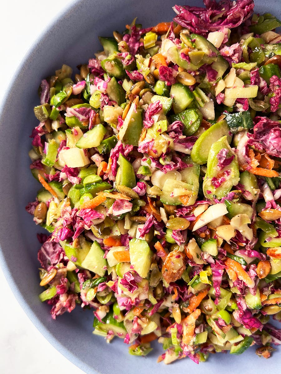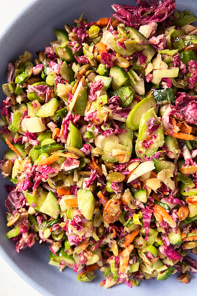 If someone asked me what my favorite salad is, I’d give them this. It has everything you need—lots of seasonal veggies and color, a satisfying crunch, and the most delicious dressing. This would be great eaten on a tostada or with grilled chicken—or even as a simple side to bring with you to a summer barbecue. Just keep the dressing and the seeds on the side until you’re ready to serve.