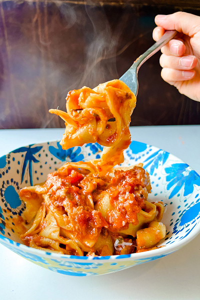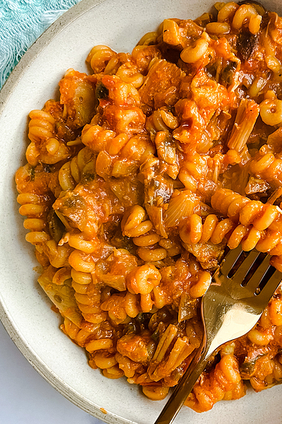 Traditional bolognese is hearty and filling, the perfect meal for cold weather. This version swaps ground meat for a variety of mushrooms and jarred artichokes to mirror the texture and the umami flavor. I used long coiled noodles for this, but it would be equally delicious with orecchiette or shells to scoop up the sauce or cavatappi for the fun swirls.
