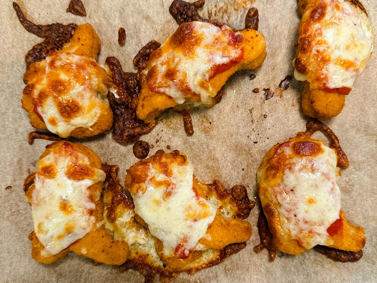 Put the nuggets on a baking sheet so the side with the well is up (unless your nuggets are perfectly flat on both sides, then it doesn’t matter). Spoon 2 teaspoons of marinara into the well and top with shredded mozzarella. Bake the nuggets according to package instructions and you’ve just made the easiest (and cutest) chicken parm ever.