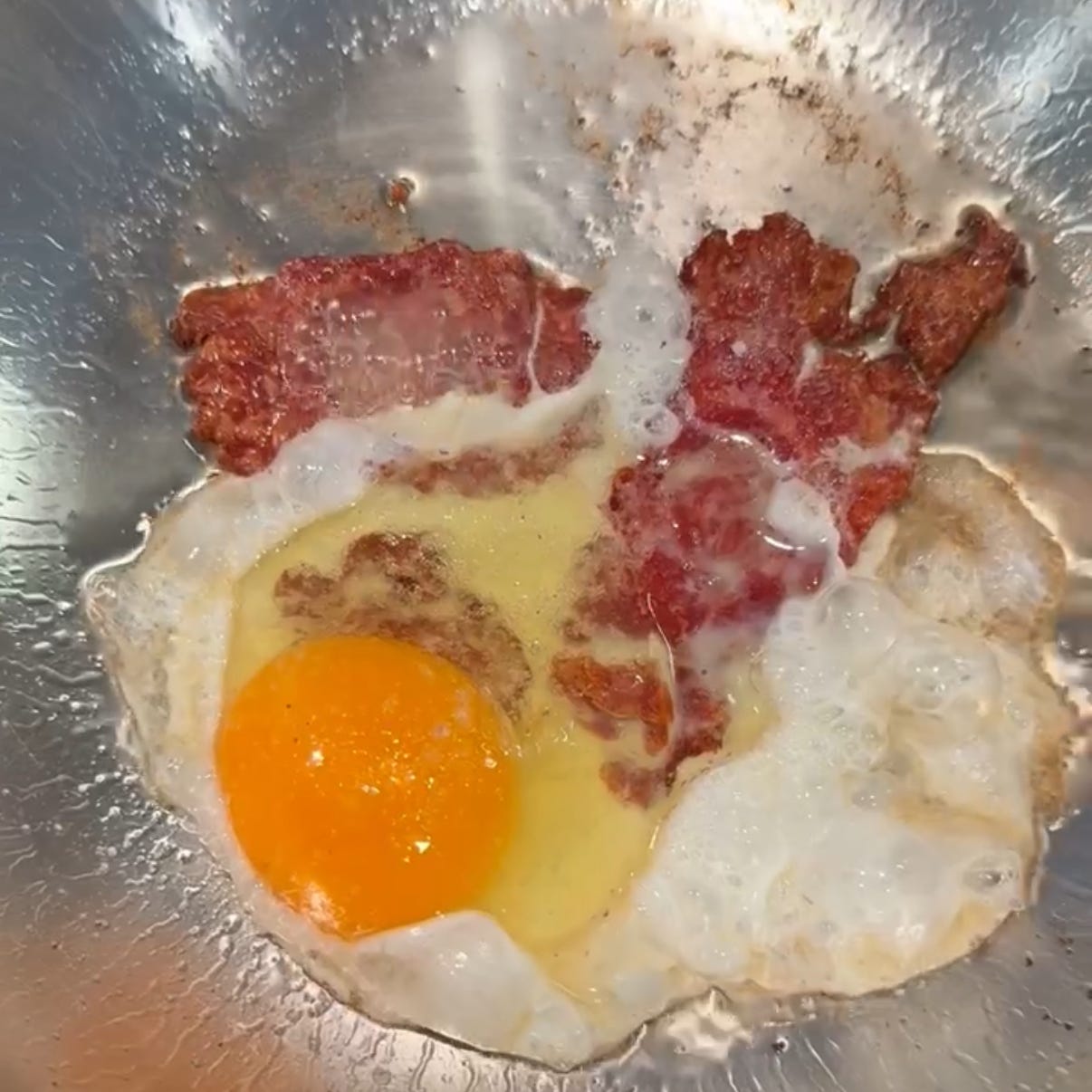 With KSP (if you know you know). We use turkey bacon; cook it with a little oil then crack an egg in. Break the yolk slightly with a fork and cook for about a minute, then flip and cook for another minute. While the egg cooks, broil or toast a piece of bread (or bagel or pita) with shredded cheese on top until the cheese is melted. Transfer the egg over the bread, then add salt, pepper, and ketchup. Cut in half to make a sandwich.