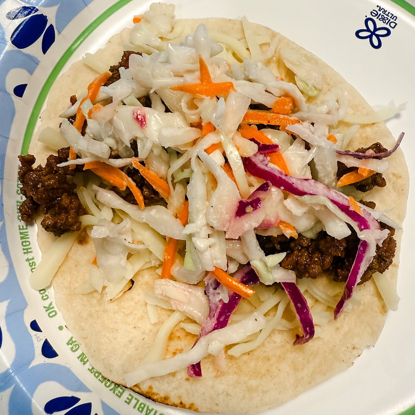 We have taco night all the time. The easiest execution: Brown ground beef (or chicken/turkey) in a pan, then stir in a packet of taco seasoning (I like mild). Serve on tortillas with leftover slaw from the night before.