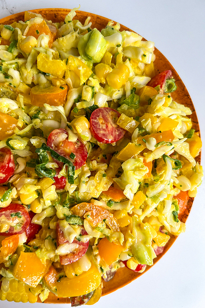 When I made this salad last year, I knew it had earned a permanent spot in my summer meal rotation. If you haven’t met the Golden Girl Salad yet, you’re in for a treat! With sweet, creamy dressing—thanks to a secret ingredient!—and lots of summer produce, this is the salad you’ll crave all summer long. It’s also great as a dip! The sweet acidity of the salad pairs really well with juicy, marinated ribs for a filling meal that makes everyone happy.
